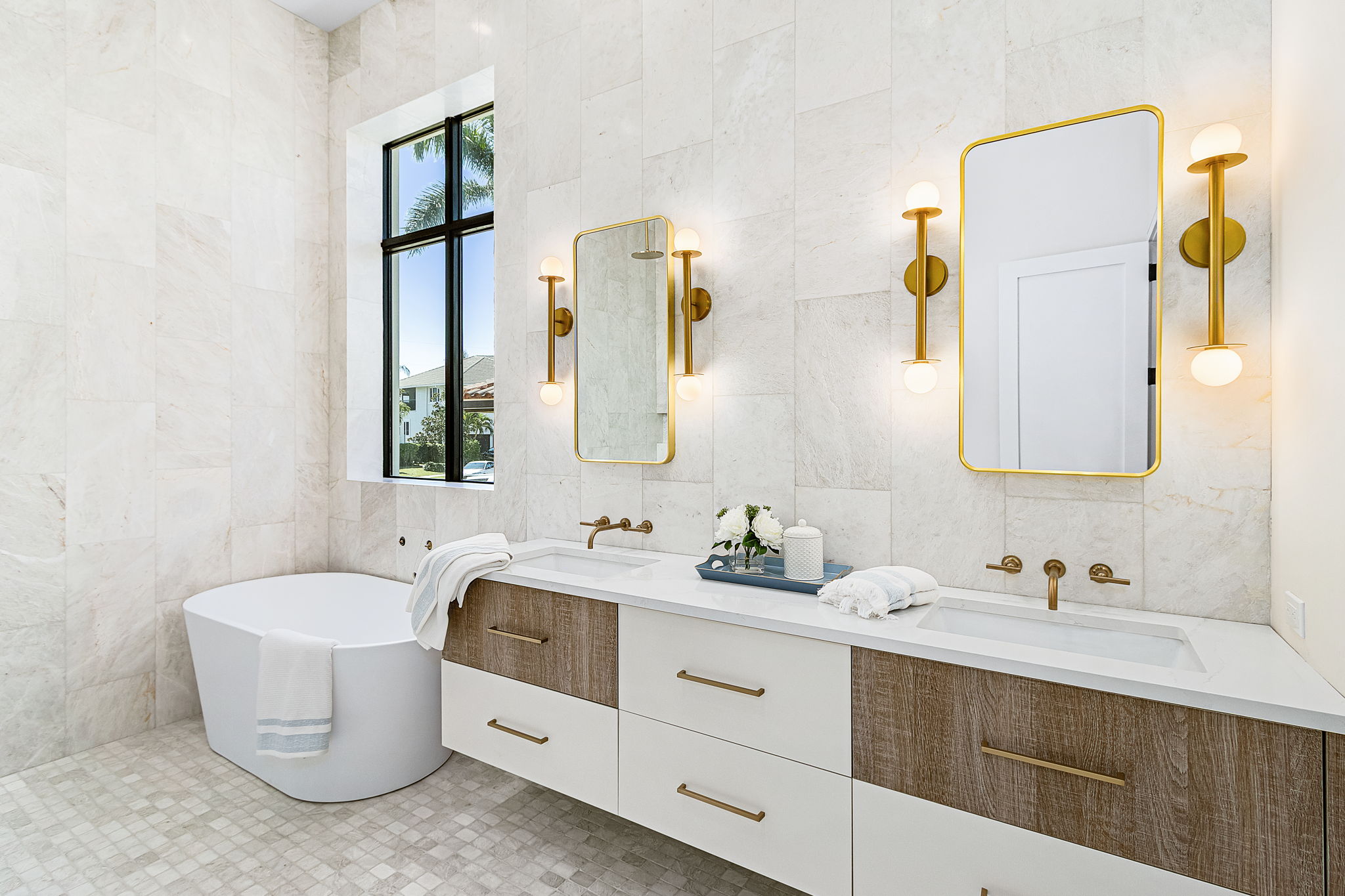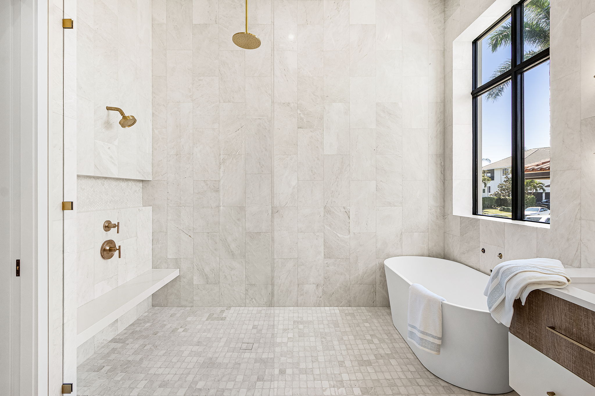 with a custom sun shelf and set against a shell-stone tile