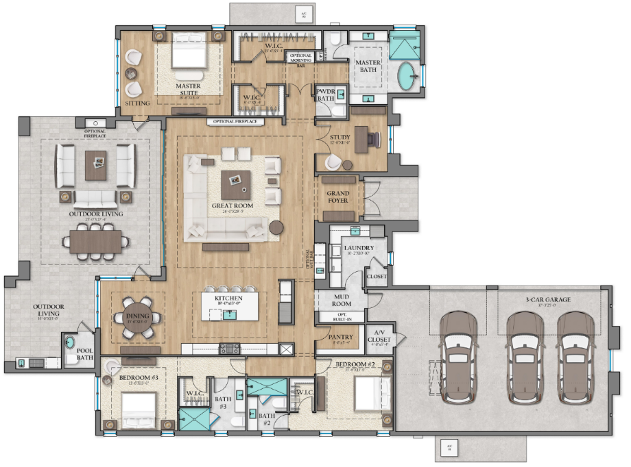 - Description: This exquisite estate home features 3 bedrooms plus study, 3 full, 2 half baths and a 3-car garage, offering an ideal blend of comfort and convenience. This thoughtfully designed floor plan highlights open-concept living spaces that seamlessly connect indoor and outdoor areas.